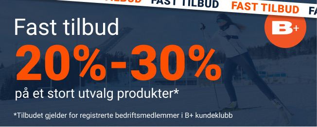 Bruk søkefeltet og menyene for å få full oversikt over vårt brede sortiment. Som registrert og innlogget bedriftsmedlem i B+ kundeklubb vil du automatisk se prisene som gjelder for deg. Rabatten kan ikke kombineres med andre tilbud.