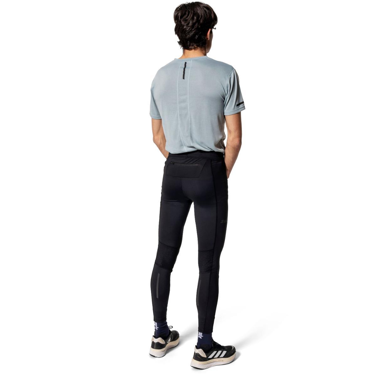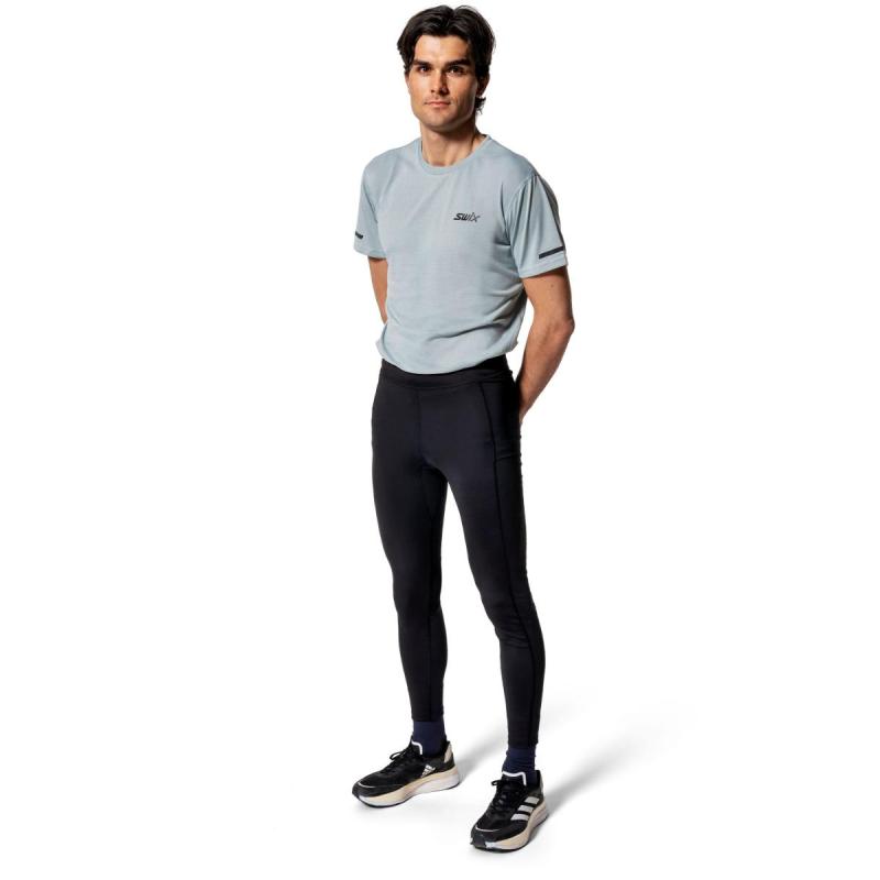 Swix Pace løpetights til herre er en høyteknisk tights laget av svært pustende og tøyelig materiale med ypperlige fukttransporterende egenskaper. Tightsen er i tillegg utstyrt med formsydde knær, perforert stretch-materiale på baksiden av knærne og ekstra elastisk panel i skrittet for optimal bevegelsesfrihet fra start til slutt. Bred strikk i livet sørger for en komfortabel passform, mens refleksdetaljer på sidene gir økt synlighet under dårlige lysforhold. Glidelåslomme bak samt stretch-lomme i siden gir trygg oppbevaring av mobil, kort og nøkler.