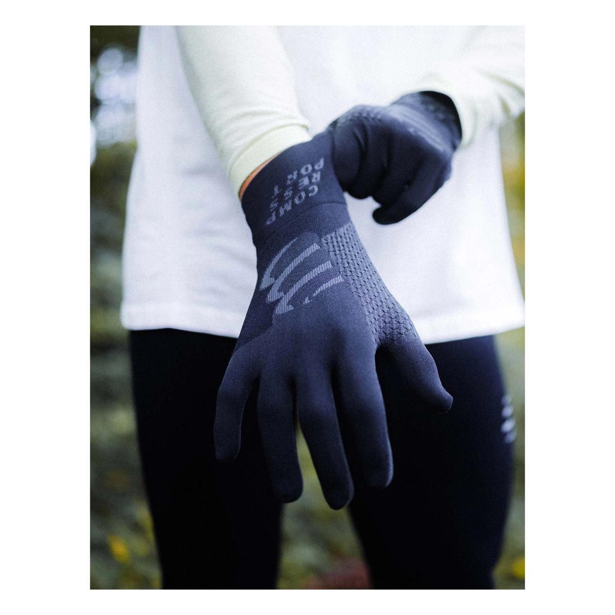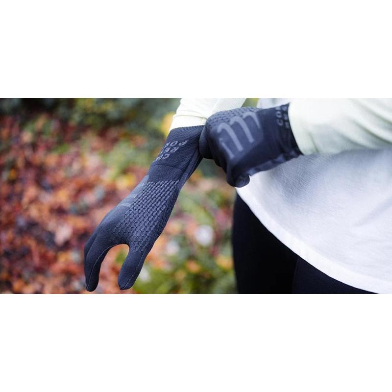 Med Compressports 3D Thermo løpehansker trenger du ikke lenger la deg stoppe av fuktig og kaldt vær. Hanskene er utstyrt med Compressports signatur 3D-vevde materiale som skaper et isolerende luftlag mellom hender og hanske for maksimal varme under kalde forhold uten unødvendig vekt. Ypperlige fukttransporterende egenskaper og høy pusteevne sørger for å holde hendene tørre selv under høyintensive økter, men mykt og komfortabelt materiale gjør at du raskt glemmer at du har de på. Ekstra tykkelse i håndflaten og rundt tommelen gir ekstra beskyttelse, mens leng mansjett sikrer minimalt varmetap rundt håndleddet. Konduksjonsmateriale i pekefinger og tommel sørger for at du kan benytte smarttelefon og annen teknologi med berøringsskjerm uten å måtte ta hanskene av deg. Compressport 3D Thermo løpehanske egner seg ypperlig til løping både på sti og vei, og kan også fint benyttes til gåturer og annen utendørsaktiviteter på kjølige dager.