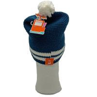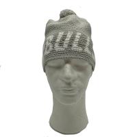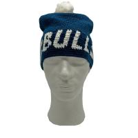 Stilig hekla fritidslue med dusk og Bull-logo.