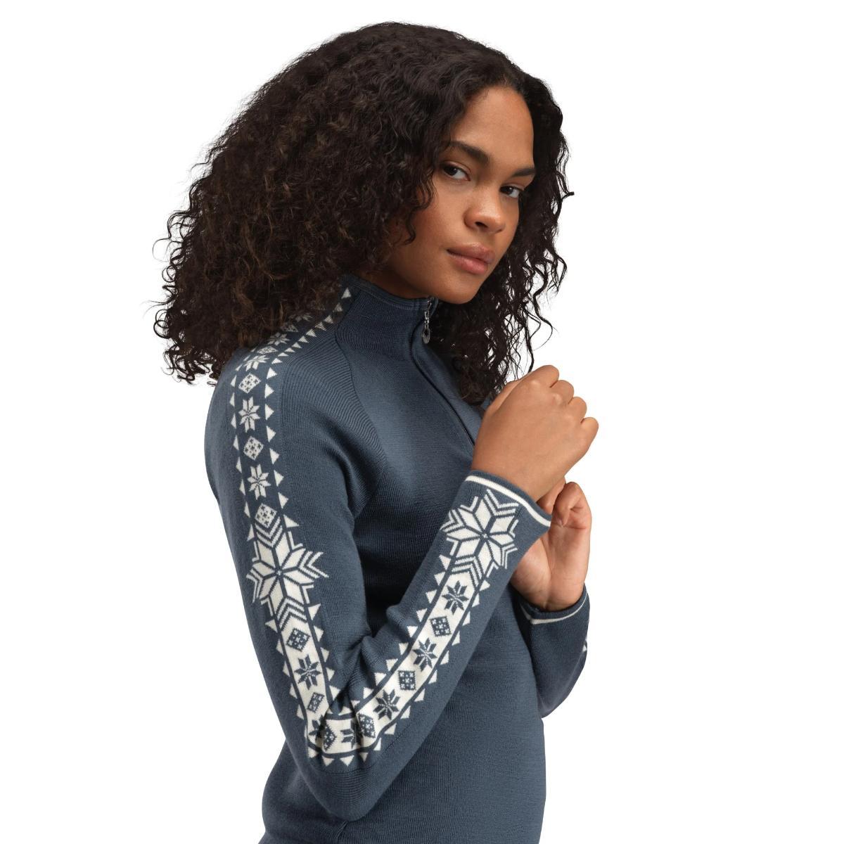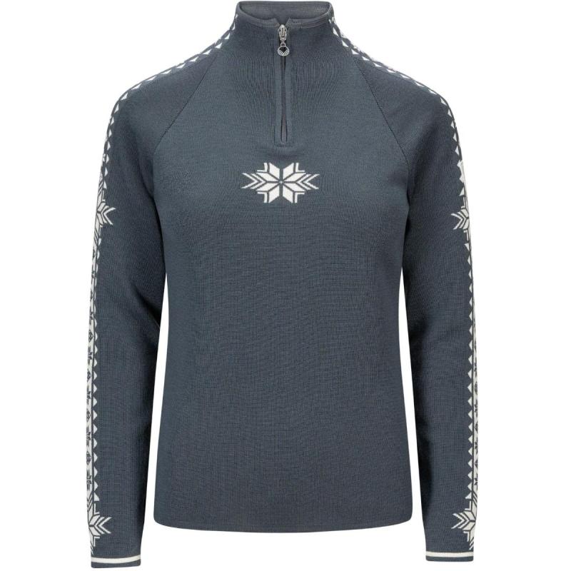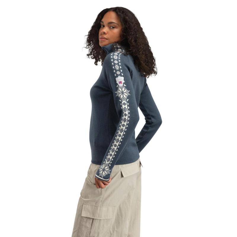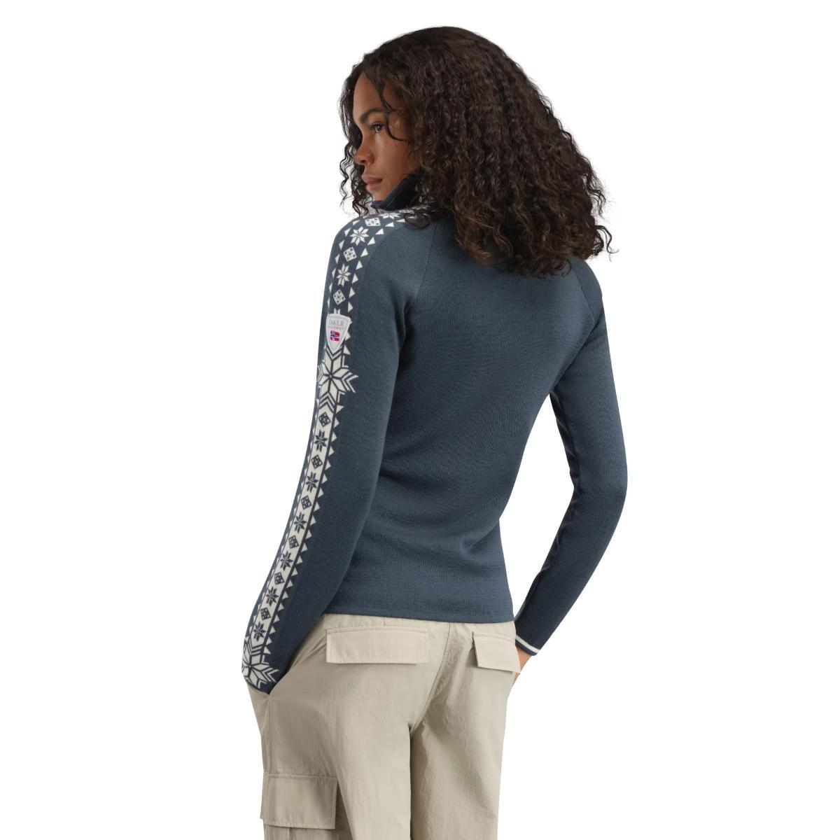 Dale of Norway Geilo ullgenser til dame har fått navnet sitt etter Norges mest populære skidestinasjon, designet med en robust dobbelstrikket konstruksjon, perfekt for en aktiv livsstil. Geilo ullgenser er laget av 100% supermyk premium merinoull for luksuriøs varme, mens medium høy hals med kvart glidelås gir ekstra komfort og allsidighet. Det repetitive mønster med åttetaggede roser på ermene kombinert med en stor rose på brystet gir genseren et klassisk utseende med et sporty preg. Geilo ullgenser til dame her en smal passform og kan vaskes i maskin på ullprogram.