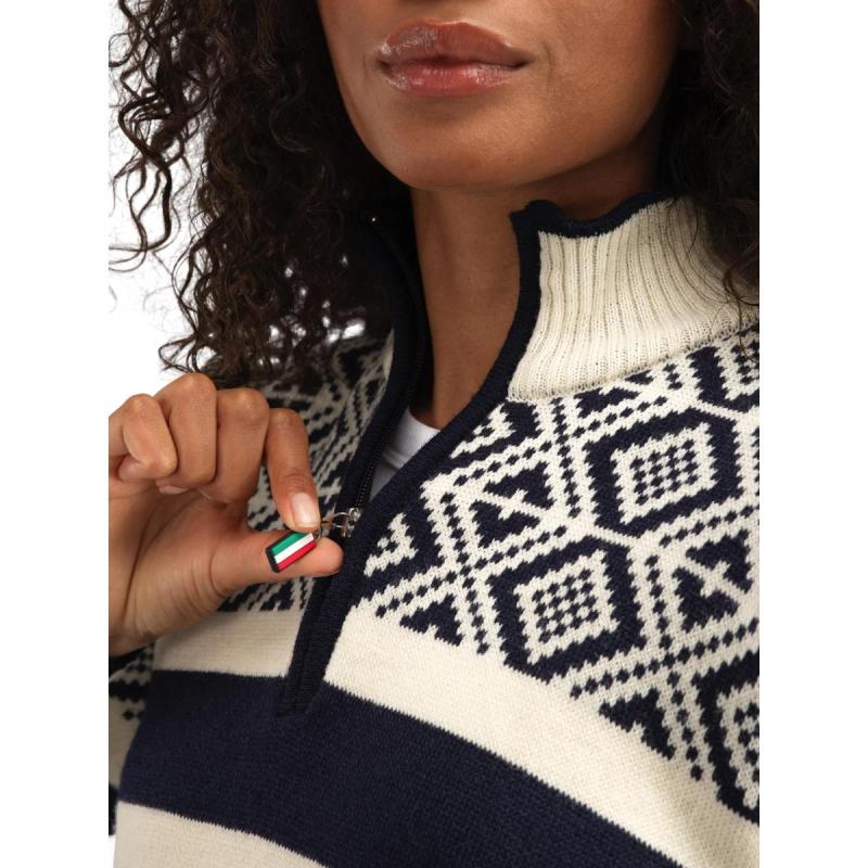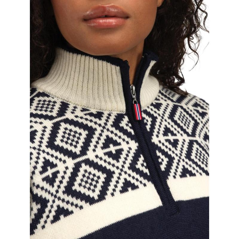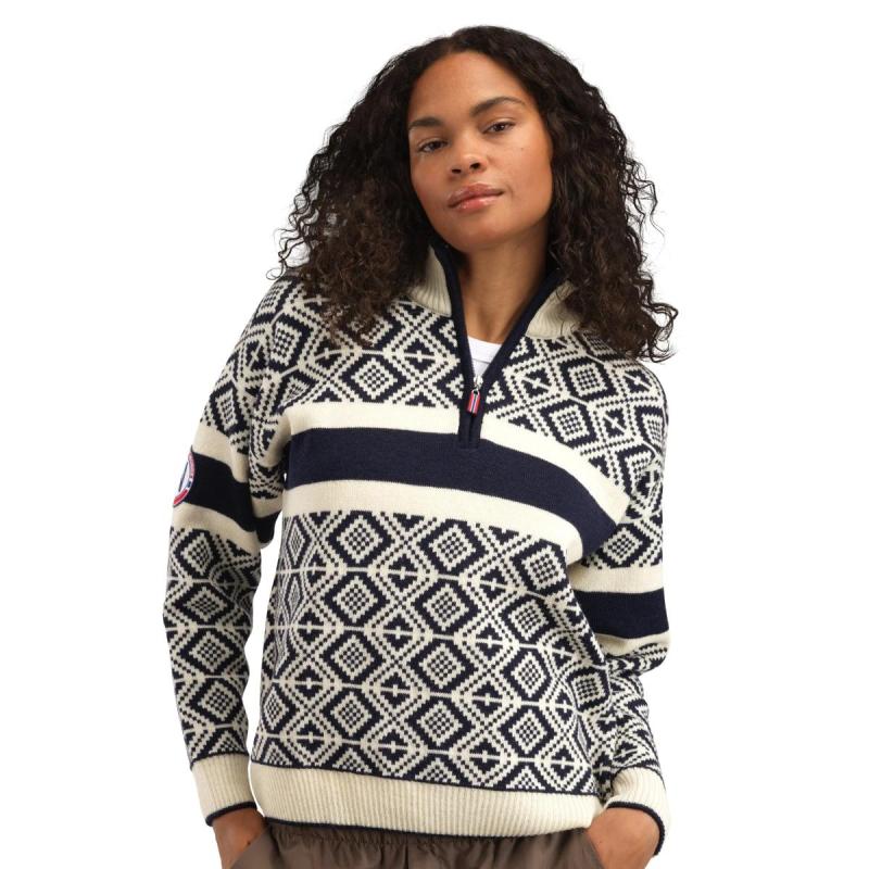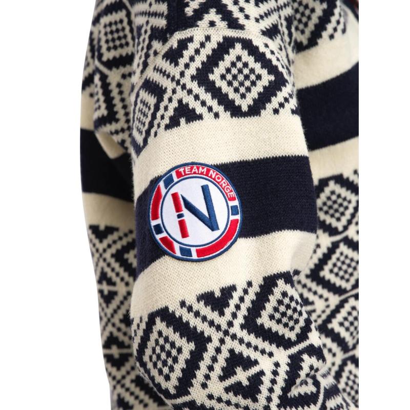 Dale of Norway Team Norway Cortina ullgenser er den offisielle genseren for den norske OL-troppen i vinter-OL i Milano Cortina 2026. Genseren er inspirert av Dales første offisielle OL-genser, den ikoniske 1956 Cortina d'Ampezzo. Denne nyforestillingen er en feiring av originalens 70 års-jubileum og hedrer syv tiår med tradisjoner. Utsiden er strikket av 100% norsk Njord-garn, kjent for å levere ypperlig varme, pusteevne og slitestyrke, mens innsiden er strikket av 100% supermyk merinoull for ekstra komfort. Høy hals med glidelås gir ekstra allsidighet.