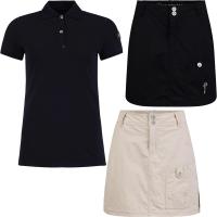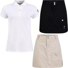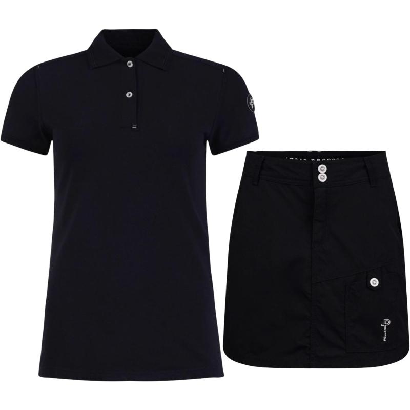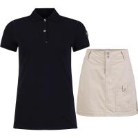 Funksjonelt og allsidig fritidssett bestående av en stilig poloskjorte i stretch-piqué, og hurtigtørkende og slitesterkt skjørt med innebygd shorts.