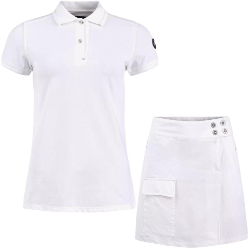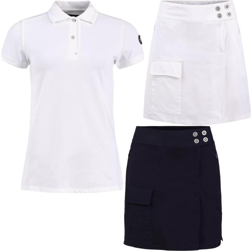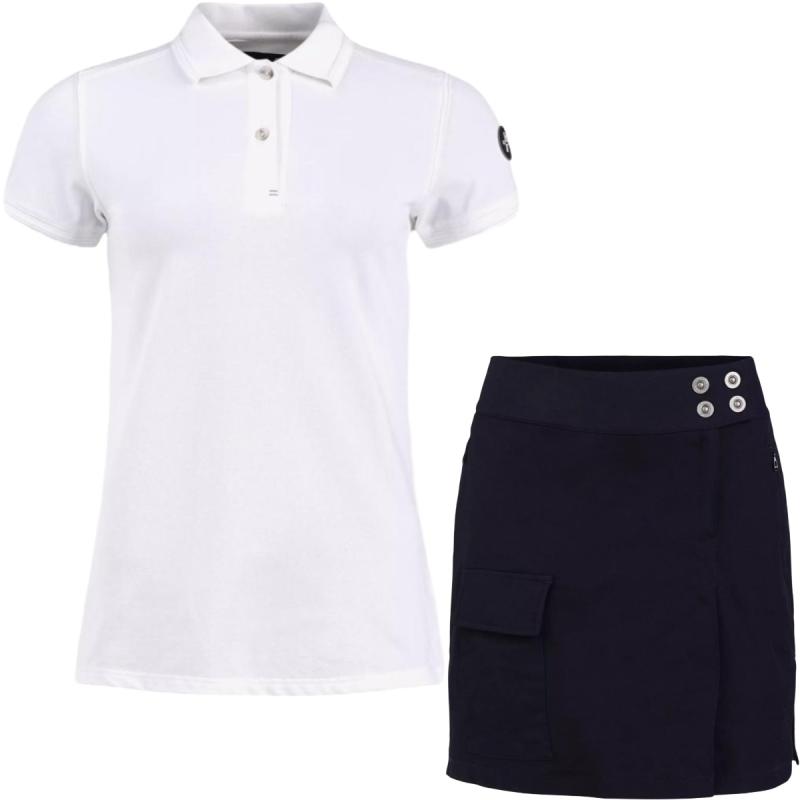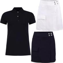 Funksjonelt og sporty fritidssett bestående av en stilig poloskjorte i stretch-piqué, og hurtigtørkende og tøyelig skjørt med innebygd shorts og splitt for ypperlig bevegelsesfrihet.