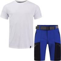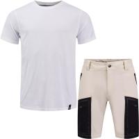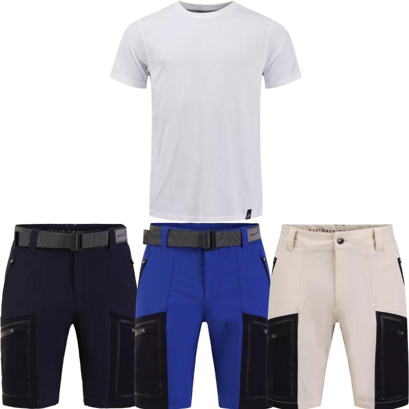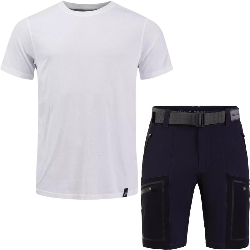 Funksjonelt og stilrent fritidssett bestående av en behagelig t-skjorte i 100% økologisk bomull, og vannavvisende shorts med forsterkede paneler, ypperlig stretch, flere praktiske lommer og medfølgende belte.