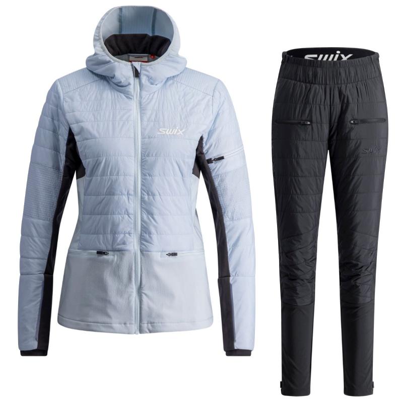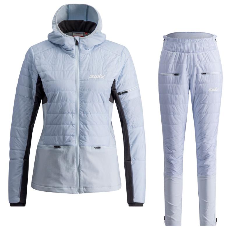 Swix Horizon skisett til dame består av en teknisk og allsidig langrennsjakke og -bukse i vind- og vannavvisende materiale som egner seg godt tilbåde tur og trening på kalde dager. Både bukse og jakke har en ettersittende passform med god elastisitet for ypperlig bevegelsesfrihet, mens PrimaLoft® Silver syntetisk isolasjon i front gir ekstra varme der det trengs mest. Glidelåslommer i front, på venstre erme og bak på buksen sørger for trygg oppbevaring av verdisaker.