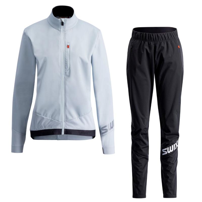 Langrennsjakke og -bukse til dame av 3-lags Gore-Tex softshell, for ypperlig vindbeskyttelse og bevegelsesfrihet.