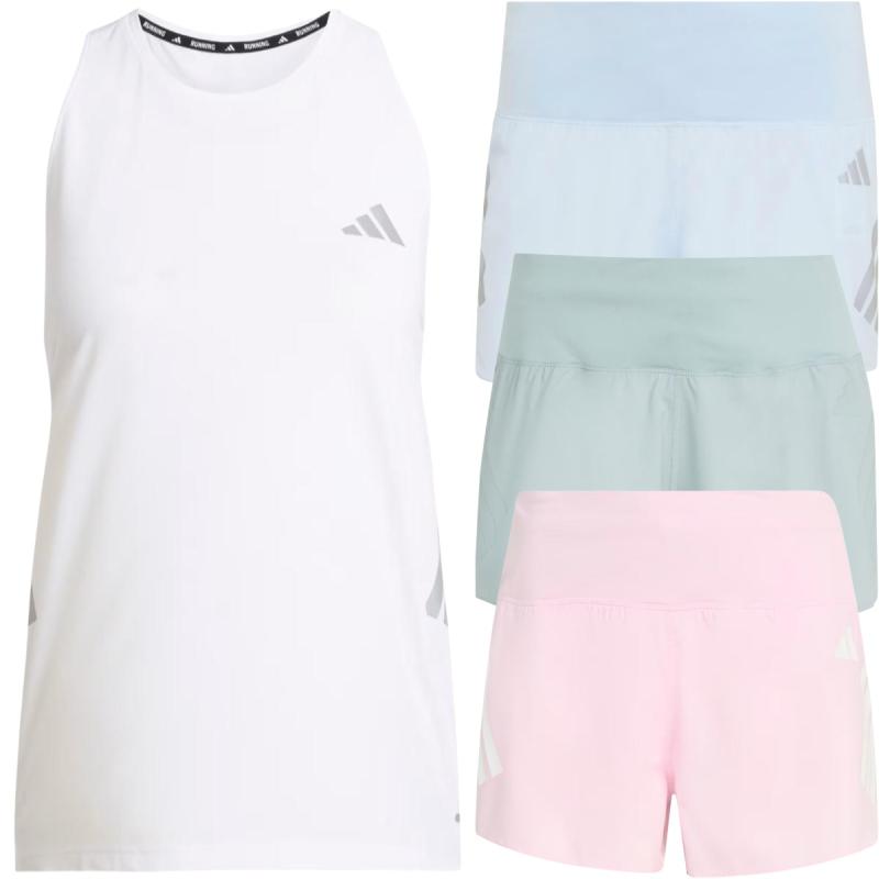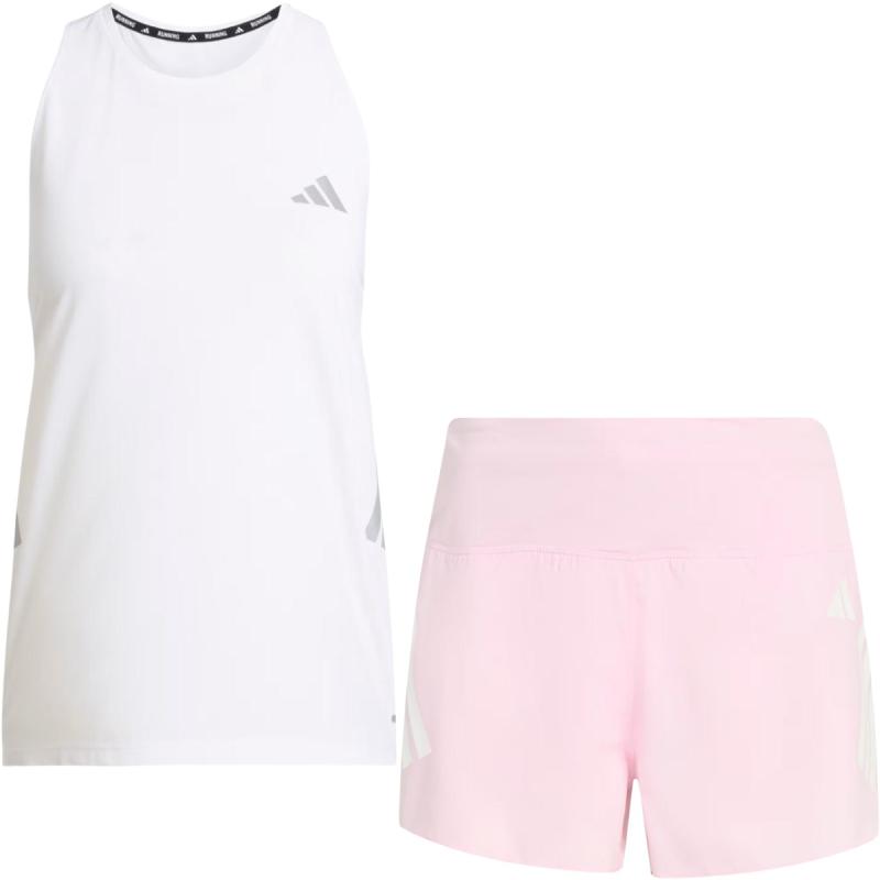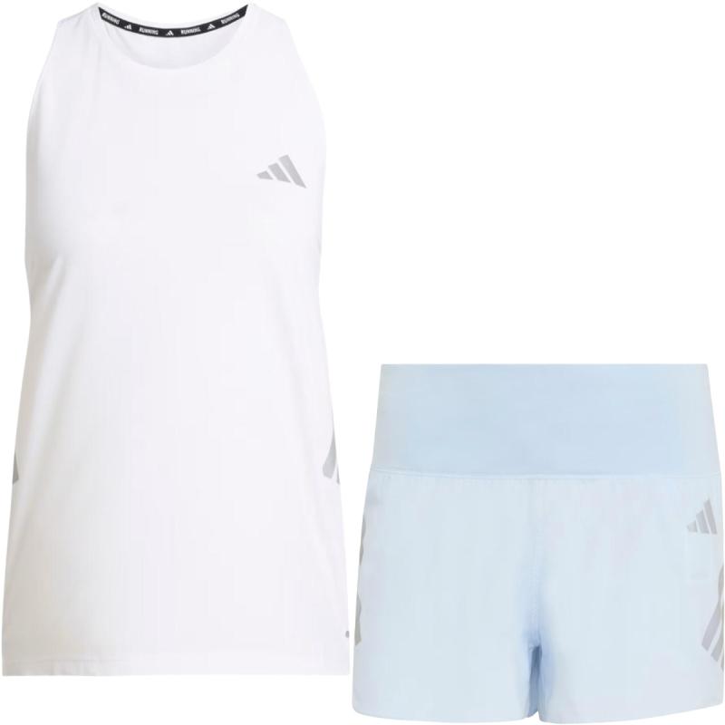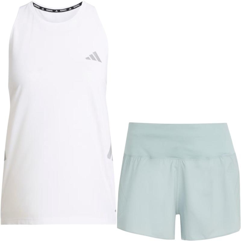 Moderne løpesett med Climacool-teknologi bestående av en hurtigtørkende singlet med et avslappet utseende, og en minimalistisk løpeshorts med støttende innertruse, glidelåslomme på ryggen og to stash-lommer i linningen.