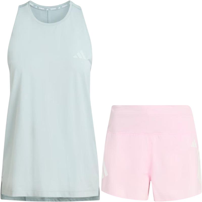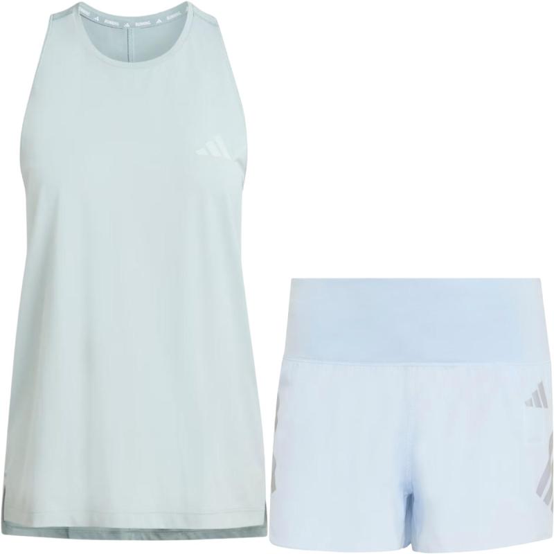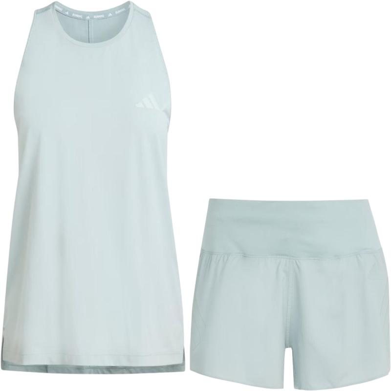 Moderne løpesett med Climacool-teknologi bestående av en hurtigtørkende singlet med et avslappet utseende, og en minimalistisk løpeshorts med støttende innertruse, glidelåslomme på ryggen og to stash-lommer i linningen.