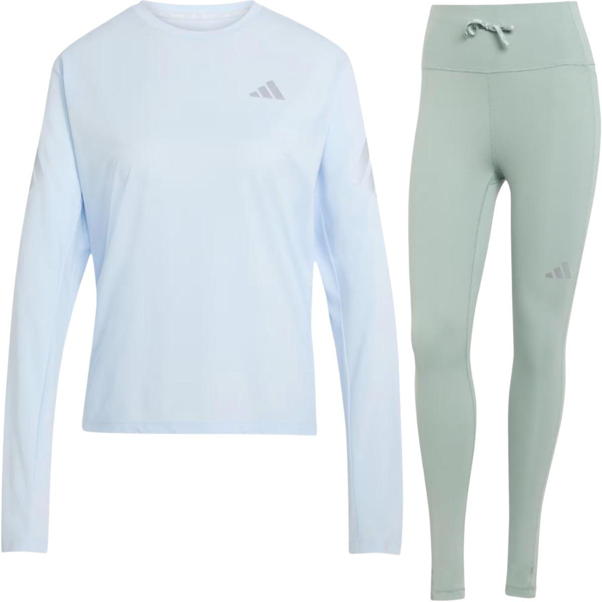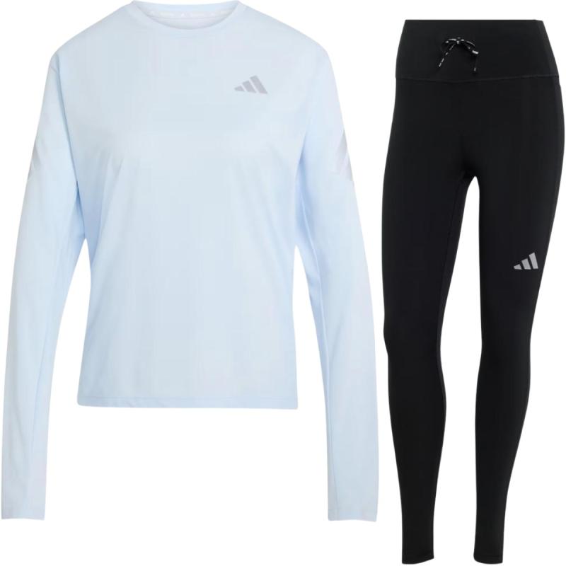 Moderne løpesett med Climacool-teknologi bestående av en hurtigtørkende langermet trøye med et avslappet utseende, og en myk og behagelig løpetights med støttende liv, stash-lommer på lårene og reflektive detaljer.