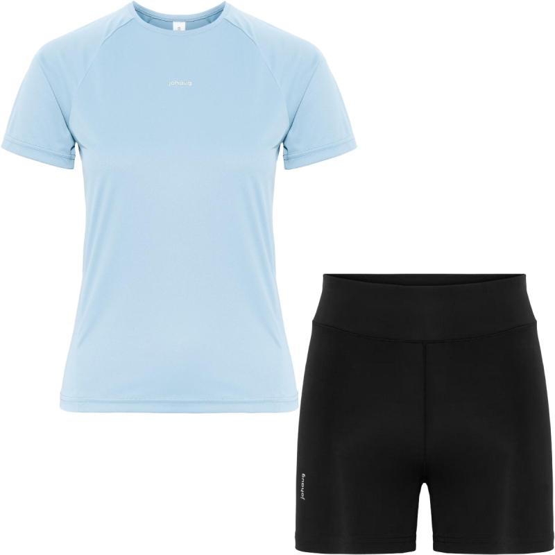 Lett og mykt løpesett med kortermet trøye og kort tights. Ypperlig stretch, flatlock-sømmer, trøye med raglan-ermer og tights med støttende liv sørger for optimal bevegelsesfrihet og komfort som egner seg både til løpeturer og gymøkter.