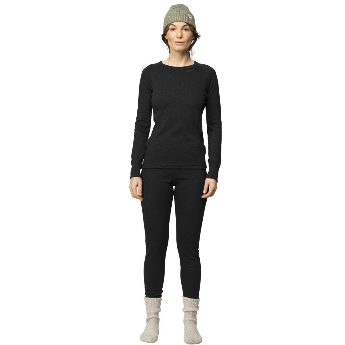 Devold Duo Active Merino 205 ullsett til dame består av et ytre lag med fin økologisk merinoull og et indre lag med ThermoLite®, en funksjonell fiber med optimale fukttransporterende egenskaper. Sammen med merinoullas isolerende egenskaper holder settet deg varm selv når du er våt og er dermed et ypperlig sett for utendørsaktivitet i vinterhalvåret. Flate sømmer sørger for god komfort. Plaggene kan vaskes i maskin og tørkes i tørketrommel.