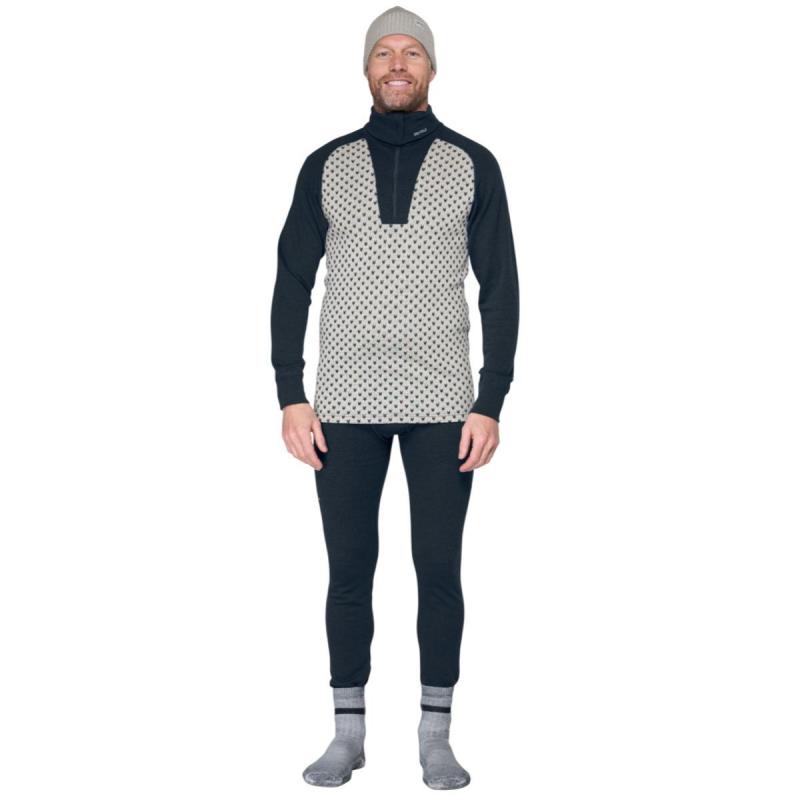 Devold Signature Merino 230 Zip Neck ullsett til herre er en del av Devolds nye signatur-kolleksjon som kombinerer tradisjon og innovasjon. Signature-plaggene kombinerer funksjonell merinoull med klassiske Devold-mønstre og er designet for kalde vinterdager. Tykk finstrikket merinoull gir ypperlig isolasjon og komfort for lange dager i alpintbakken eller under andre utendørsaktiviteter med lav- til medium intensitet hvor det er viktig å holde varmen.
