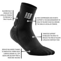 CEP Achilles Support Short kompresjonssokk til herre leverer høy grad av kompresjon fra fot til ankel. Rehabilitering etter skade på akillessenen krever stabilisering, kompresjon og beskyttelse, og CEPs Achilles Support sokker leverer nettopp dette. SMART SILICONE-padding beskytter akillessenen fra slag og forhindrer videre skade i tillegg at den hjelper med å stabilisere slitne sener. Kompresjon øker blodgjennomstrømning og reduserer hevelse for økt smertelindring. Fotbuestøtte reduserer fare for skade, mens lav bulk kombinert med pustende og fukttransporterende materiale motvirker sjansen for gnagsår og blemmer.
