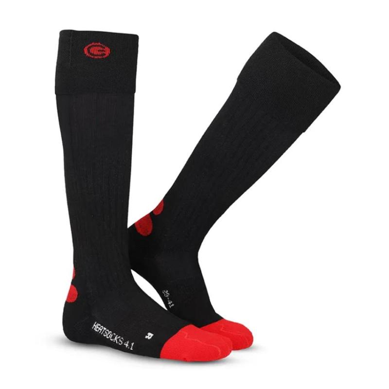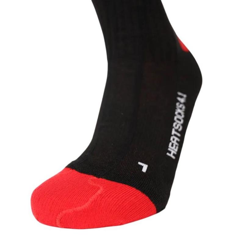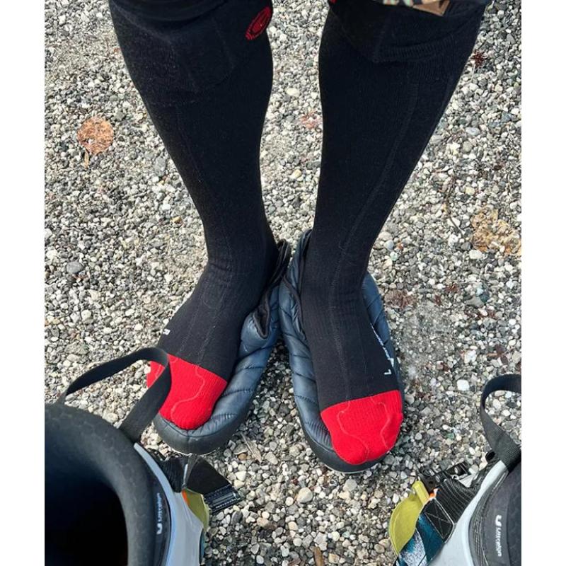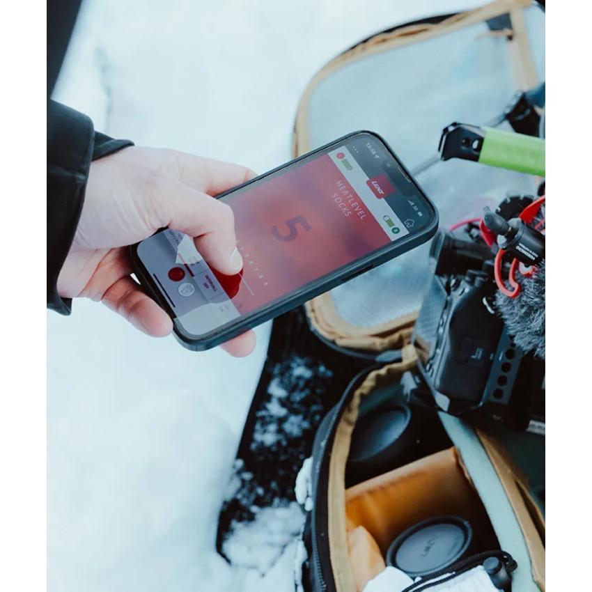 Varmesokker med innsydde varmeelementer rundt tærne og medfølgende batteripakke.