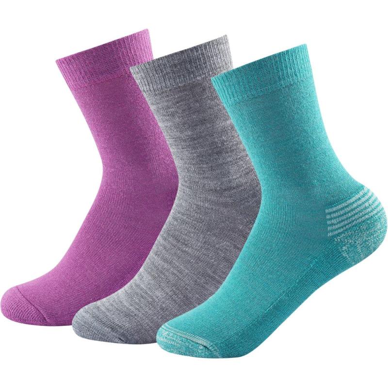 Devold Daily Medium ullsokk til barn er en myk og behagelig hverdagssokk med frottésåle for ekstra isolasjon og slitestyrke. Daily Medium holder deg varm på kalde dager, er naturlig luktresistent og krever lite vask. Sokken har forsterket tå og hæl og frottésåle, samt komfortabel strikk på leggen. Pakken inneholder 3 par sokker.