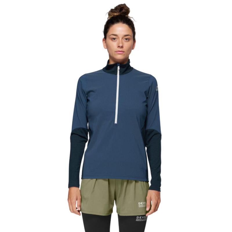Devold Endurance Cover Zip løpetrøye til dame er en oppdatert versjon av Devolds populære Running Cover-trøye, utviklet for utendørs langdistanse året rundt. Trøyens front, skuldre og øvre del ermer er utstyrt med en ultralett, vindavvisende merinoullblanding for god beskyttelse mot elementene. Baksiden, kragen, og nedre del av ermer benytter 200g 100% merinoull for optimal komfort og fukttransporterende egenskaper. Det oppdaterte merinomaterialet er kraftigere og mer robust enn noensinne. Passer ypperlig som eneste lag eller som et ekstra lag over et varmende baseplagg.