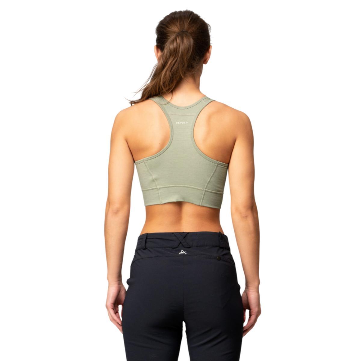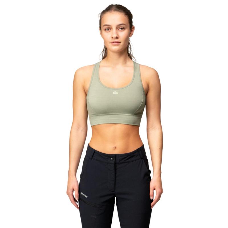 Devold® Berle BH i 100 % merinoull har brede og komfortable skulderstropper. Ryggen i racerstil sørger for at stroppene ikke kommer i konflikt med sekken din. Den har flate sømmer som ikke irriterer huden og det doble stofflaget gir maksimal varme og støtte. Siden Berle BH er laget av 100 % merinoull, vil den holde deg varm og tørr under høyintensive aktiviteter.