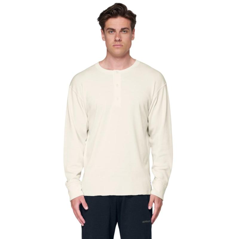 Devold Henley langermet ulltrøye til dame og herre er et nikk til den klassiske norske "bestefartrøya" fra 50-tallet. Med et stilig retrodesign, rund hals med knappestolpe og løs passform i naturlige farger kan denne trøya brukes både som genser og som mellomlag. Myk merinoull sikrer en behagelig passform og ypperlig isolajon og temperaturregulering.