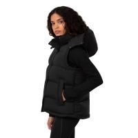 Varm og komfortabel dunvest med ekstra lengde, justerbar hette, høy hals og fleecefôrede lommer.