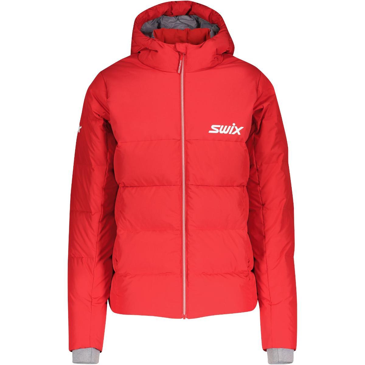 Swix Team dunjakke til herre er en god og varm dunjakke i et klassisk design, ypperlig for å holde deg varm før og etter trening eller til hverdags. Jakken er utstyrt med ekstra fyll i kragen, samt vanntett materiale over skuldrene for ekstra værbeskyttelse. Justerbar hette og fald sikrer god passform, mens dobbelt lag med finstrikket stoff ved mansjetten hindrer ermene i gli opp. To håndlommer i front med glidelås gir trygg oppbevaring av verdisaker. Team-dunjakkene er fylt med etisk RDS-sertifisert dun.