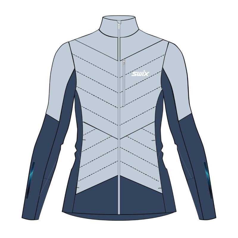 Swix Nordic Warm Hybrid vattert skijakke til dame er utstyrt med PrimaLoft® isolasjon i front og øverst på ermer og pustende paneler bak for en intensive økter i kaldt vær. Jakken er konstruert etter bodymapping-prinsippet for optimal bevegelsesfrihet. 3-lags vindtett materiale i front, på ermene og i sidene gir ekstra værbeskyttelse, mens stretch-mansjetter og stramming nederst gir en komfortabel passform. Jakken er utstyrt med 3 glidelåslommer i front for trygg oppbevaring av verdisaker.