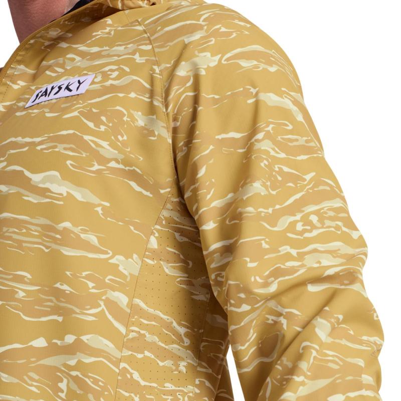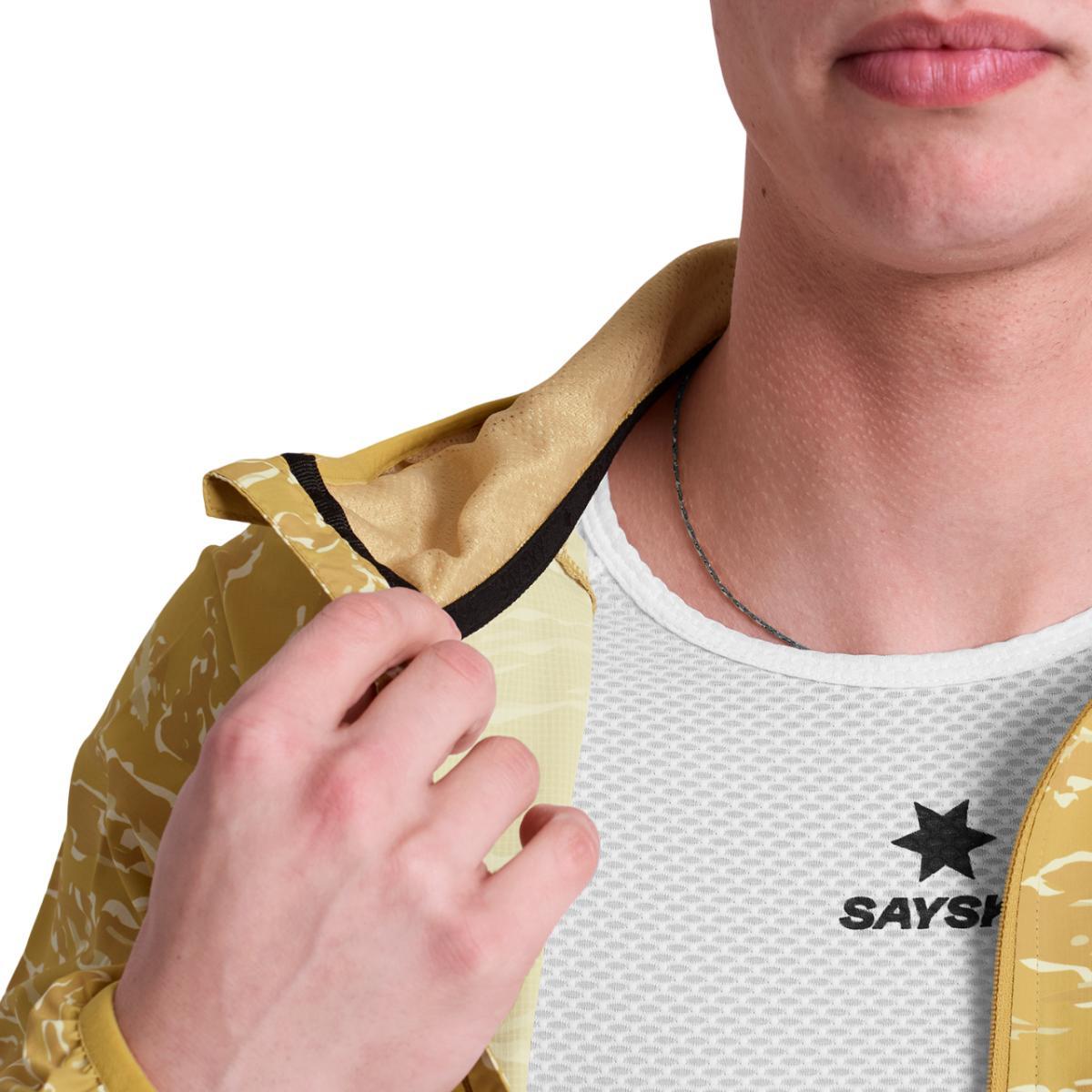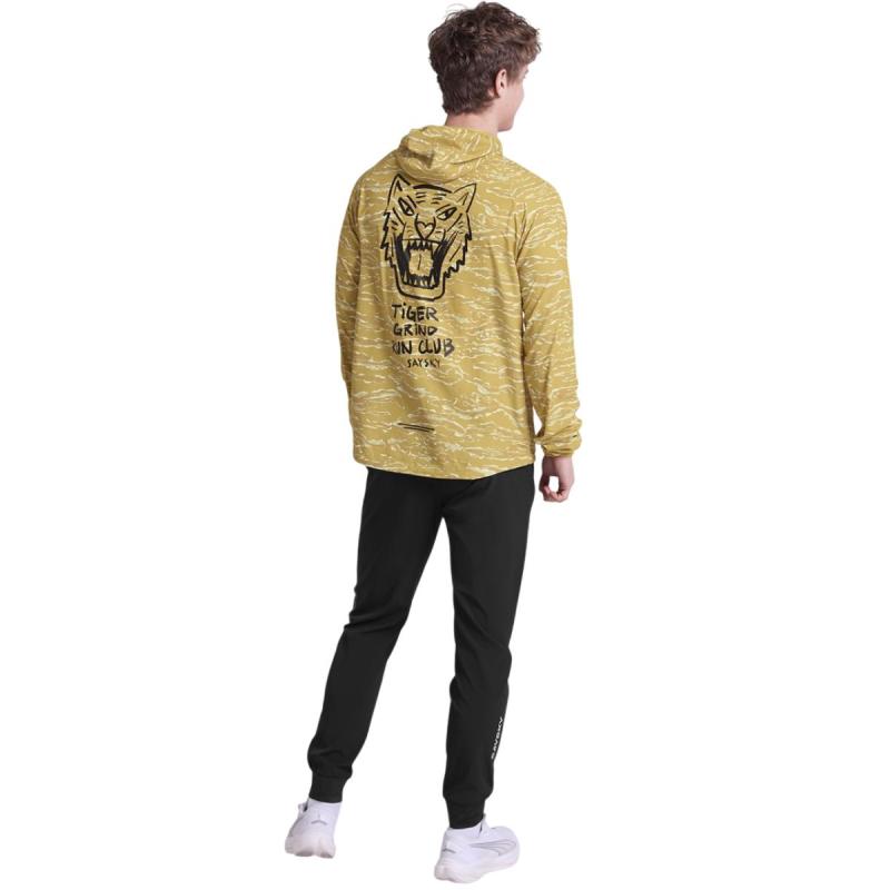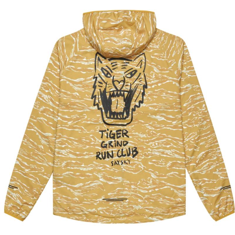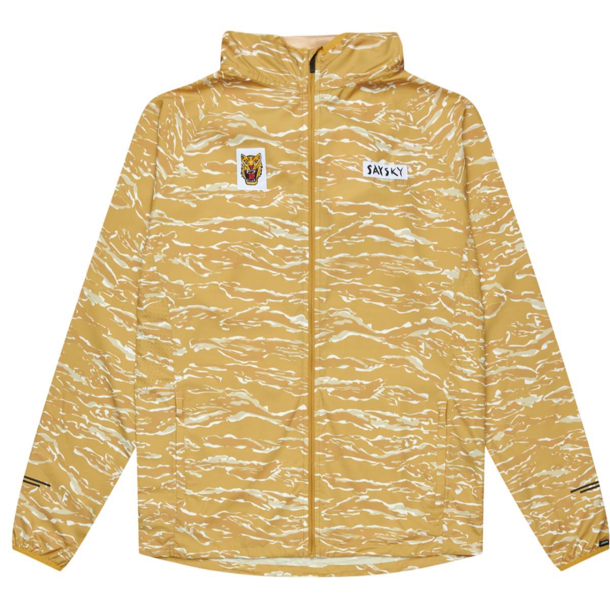 SAYSKY Tiger Pace løpejakke til herre er en allsidig helårsjakke laget av lette og pustende materialer. Jakken leverer uhindret bevegelse med et modig mønster og SAYSKY-grafikk på ryggen, utstyrt med en normal passform som gir rom for lag under på kaldere dager. Fukttransporterende teknologi kombinert med knappenålshul under armene sørger for å holde deg tørr og komfortabel under variert intensitet, mens elastiske mansjetter og stramming nederst på kropp gir en sikker og behagelig passform. Hette gir ekstra beskyttelse ved behov, mens reflektive detaljer gir økt synlighet under dårlige lysforhold. To glidelåslommer i sidene sørger for trygg oppbevaring av verdisaker.