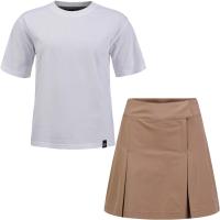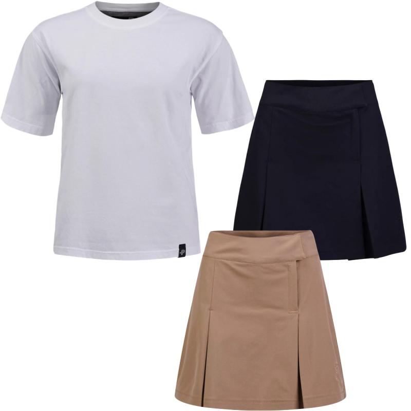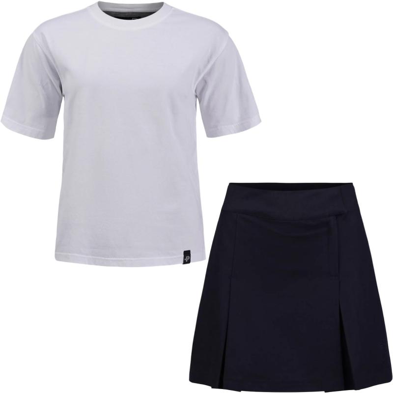 Funksjonelt og sporty fritidssett bestående av en behagelig t-skjorte i 100% bomull, og hurtigtørkende og tøyelig plisséskjørt med innebygd shorts for ypperlig bevegelsesfrihet.