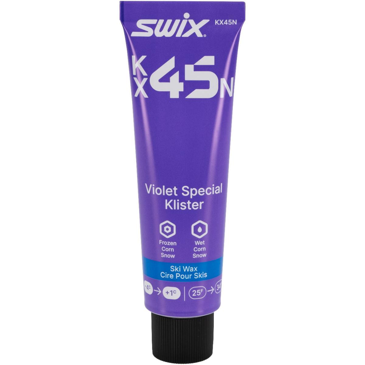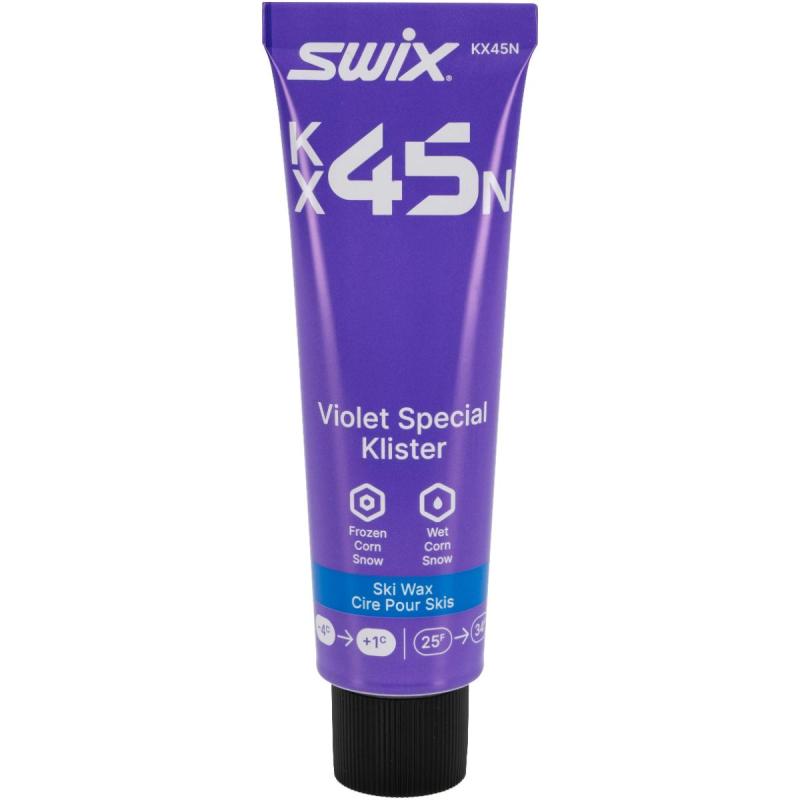 Swix KX45N Fiolett Spesial er et klister for både frossen og våt kornete snø og temperaturer mellom -4°C til +1°C. Som topplag fungerer KX45N svært godt på grovkornet snø når lufttemperatur går fra minus- til plussgrader. Som mellomlag anbefales KX20 eller KB20 under. Et ypperlig klister for vanskelig nullføre. Plastskrape medfølger ikke.