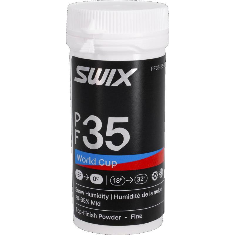 Swix PF35 World Cup pulver er et finishing-pulver for finkornet og ny snø. Pulveret benytter Swix' CrystalShield-teknologi for å skape en robust, jevn og hurtigvirkende coating som minimerer kontaktområdet mellom skibasen og fine nysnøpartikler. PF35 yter aller best på mellomtørr snø med en fuktighet på mellom 20% og 35%. For temperaturer fra -8° til 0°C.