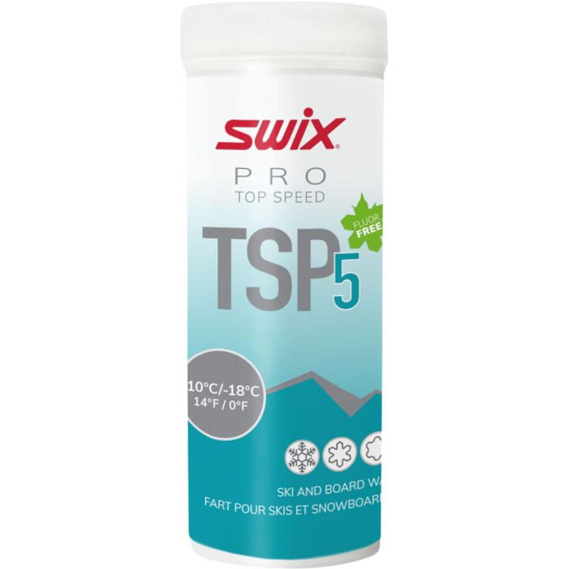 Swix TSP5 Turkis er det hardeste pulveret i TSP-serien og er et glimrende valg under kalde forhold, både til langrenn og alpint. Den er en favoritt blant servicemenn på grunn av overlegen slitestyrke og tørrfriksjonsegenskaper. Det er lagd som pulver for å gjøre den lettere å påføre, uten at det går utover glidegenskapene. For nysnø, omdannet snø og kunstsnø. Hastigheten på smørejernet bør være ca. 8-10 sek. på en skøyte- eller alpinski. Det er viktig å ha et godt smørejern for å få effektiv smelting av pulveret. TSP5 kan brukes som racingpulver alene eller som underlag for toppinger. Anbefalt smørejernstemperatur: 180-200°C.