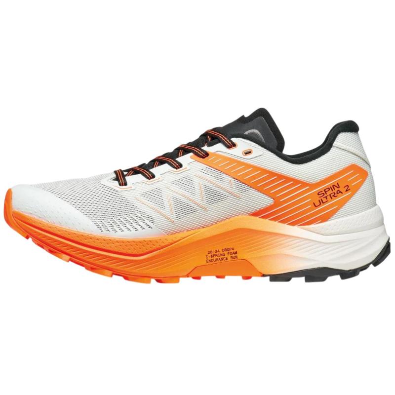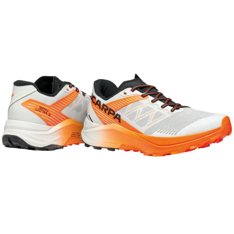 Scarpa Spin Ultra 2 henter inspirasjon fra ultradistanseløpere, designet for å takle lange distanser over alt slags terreng. Skoen kombinerer lav vekt, presisjon og slitestyrke og leverer den perfekte balansen mellom demping og responsivitet under selv de mest krevende løpene. BOUNCE FOAM midtsåle leverer uslåelig energiretur, støtte og demping i overgangene, mens Vibram® slitesåle med MEGAGRIP gummiblanding og Scarpas ekslusive design sikrer eksepsjonelt grep og tilpasningsdyktighet på alt slags underlag. Overkonstruksjonen benytter Scarpas EXO- og SockFit LW-system. Det utvendige EXO-systemet er utstyrt med laterale forsterkninger som utgjør en helintegrert del av overkonstruksjonen og fungerer som et eksoskjelett som leverer lateral støtte og holder foten på plass. Innvendig omfavner Scarpas innovative SockFit LW-konstruksjon foten som en sokk og gjør at skoen føles som en forlengelse av deg. SockFit LW-systemet, utviklet spesielt for terrengsko, er dessuten utstyrt med en tunge laget av ett enkelt stykke stretch-materiale som omfavner innsteget for bedre lateral stabilitet og kontroll over teknisk terreng.