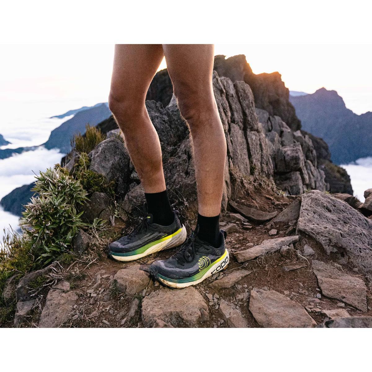 Vista er en ny maksdempet terrengsko fra Topo, designet for fart og moro over teknisk terreng. Skoens 38x33mm ZipFoam™ mellomsåle leverer den perfekte blandingen av demping, respons og underfotsbeskyttelse. Dette er et proprietært blandingsskum som er spenstigere enn EVA-skum samtidig som det beholder energireturen gjennom skoens levetid. Rocker-designet sikrer en jevn og komfortabel løpsfølelse. Vibram® Megagrip slitesålen er utstyrt med 4mm knaster for ypperlig grep og trekkraft, mens Topos spesialutvikelde FKT innersåle gir reponsiv demping og støtte, laget av fukttransporterende skum for effektiv drenering under våte forhold. I likhet med andre Topo-modeller, er Vista også utstyrt med en romslig tåboks som lar tærne spre seg naturlig for økt komfort. Kompatibilitet med gamasjer gir mulighet for ekstra værbeskyttelse ved behov.