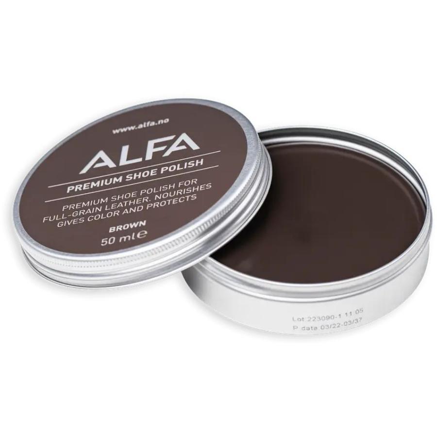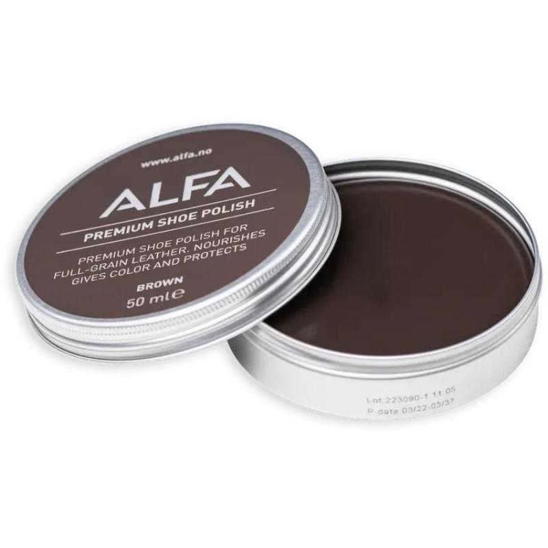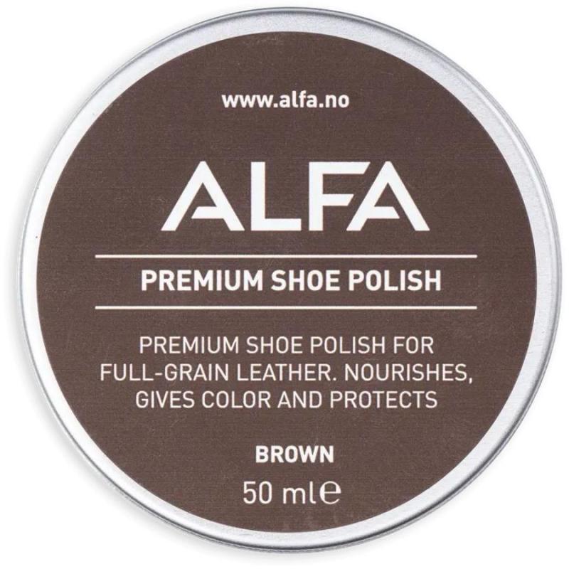 Alfa brun skokrem pleier, beskytter og bringer fargen tilbake til fullnarvet nær, og er et essensielt verktøy for vedlikehold av dine lærsko/-støvler. Skokremen er vannbasert og inneholder kun naturlige ingredienser.