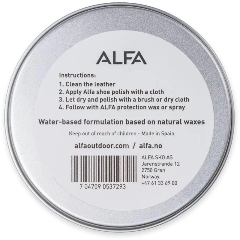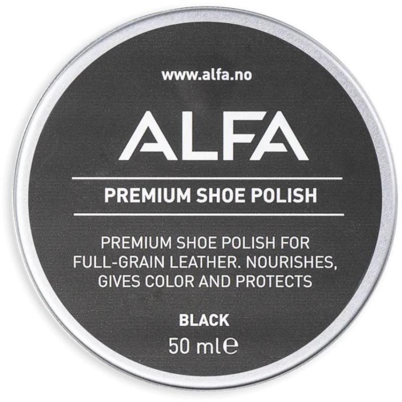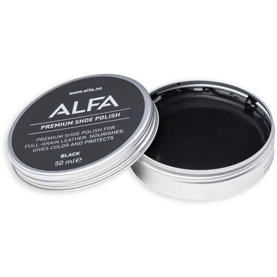 Alfa sort skokrem pleier, beskytter og bringer fargen tilbake til fullnarvet nær, og er et essensielt verktøy for vedlikehold av dine lærsko/-støvler. Skokremen er vannbasert og inneholder kun naturlige ingredienser.