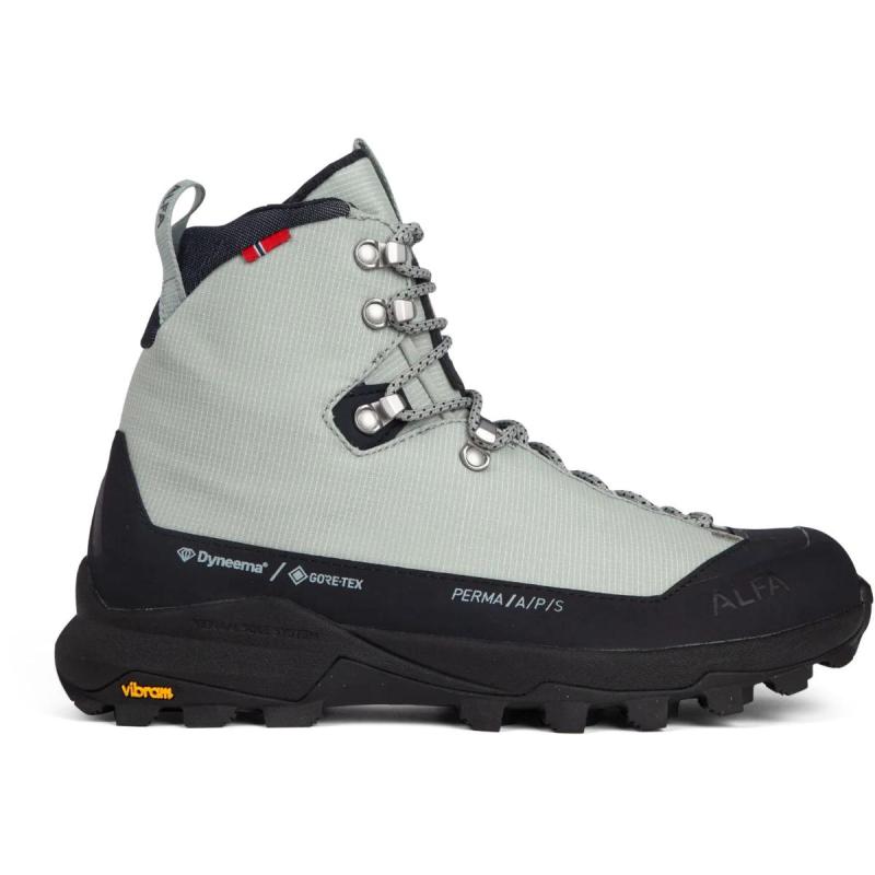 Alfa Perma GORE-TEX til dame er en fjellstøvel for kalde forhold som kombinerer eksepsjonell slitestyrke og lav vekt. Overkonstruksjonen er laget med Dyneema®-fibre, verdens sterkeste fiber, og sikrer ultimat ytelse i krevende terreng. Dette er kombinert med Solarcore® aerofoam, et NASA-inspirert isolasjonsmateriale som leverer uslåelig varme selv under kompresjon, og Vibram® Litebase slitesåle med Traction Lugs og ICETREK gummiblanding for pålitelig grep på isete og kalde overflater. GORE-TEX-liner holder føttene tørre og komfortable, mens midtsåle av EVA-skum gir god demping og stabilitet uten unødvendig vekt. Det innovative lissesystemet muliggjør rask og enkel tilpasning for en optimal passform, mens en beskyttende gummirand rundt hele skoen gir ekstra beskyttelse mot slitasje for økt levetid. Alfa Perma GORE-TEX er den ultimate støvelen for krevende fjellturer under kalde vinterforhold.