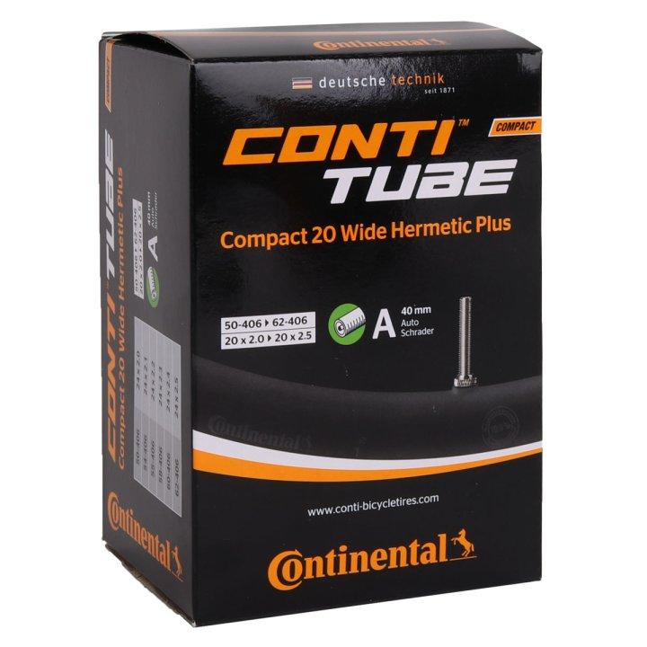 Continentals Hermetic Plus-slanger har et høyere butyl-innhold og tykkere vegger som holder bedre på luften og gir bedre beskyttelse mot punktering. Denne slangen passer 20" dekk med bredde fra 2.0 til 2.5". Utstyrt med 40mm schrader-ventil.