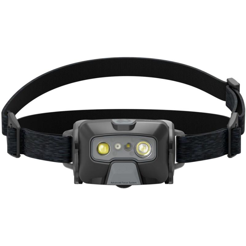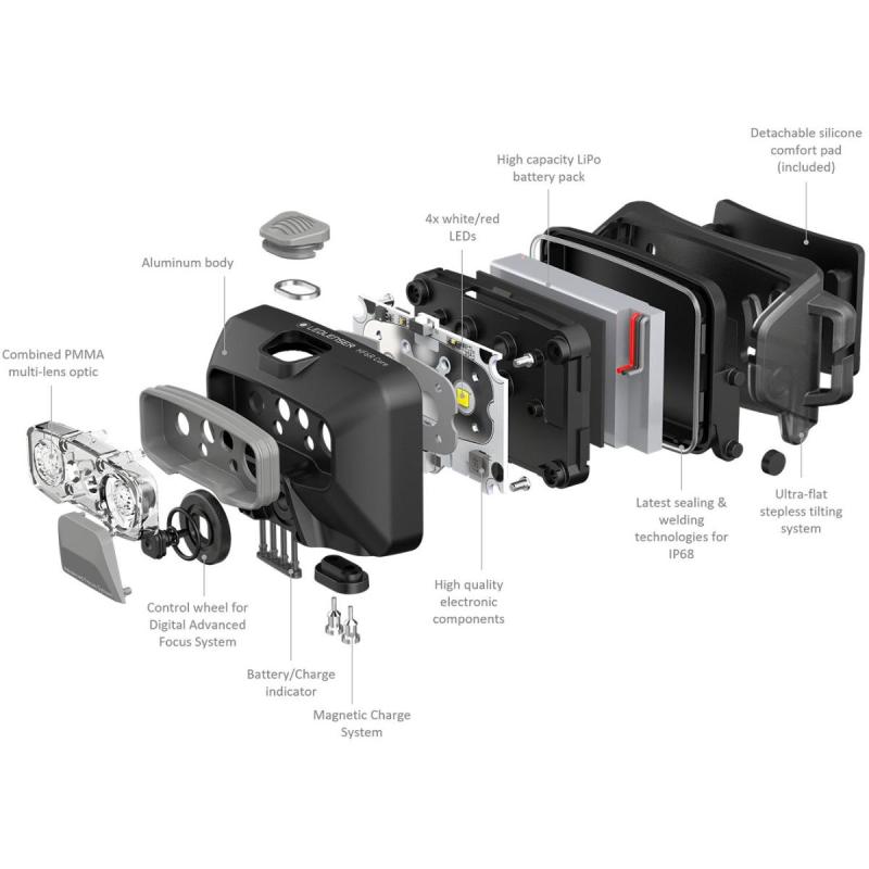 Lett, kompakt og intuitiv hodelykt på 500 lumen med avansert fokuserings-funksjon, rødt frontlys, og smart magnetisk lading.