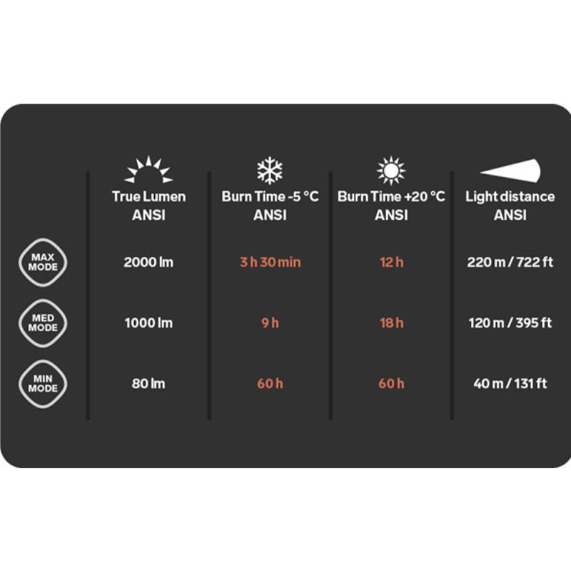 Minimum lysstyrke (80 lumen) gir deg mulighet til å gjennomføre lange treningsøkter uten å miste lyset. Denne funksjonen er perfekt for lange gåturer der det ikke kreves sterkt lys. Exceed 4XT har også en boost-modus på 2300 lumen som gir deg ekstra sterkt lys når det kreves.