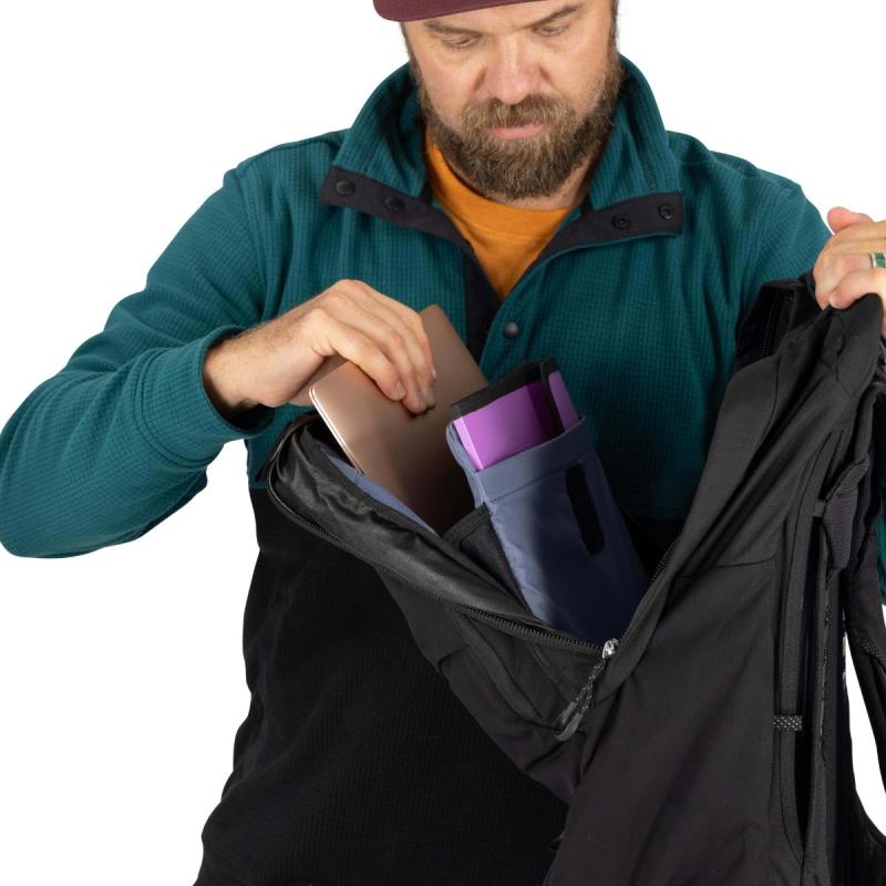 Pendlersekk med justerbar rygglengde, integrert fotstøtte og mulighet for utvidelse av volum fra 26 til 34 liter.