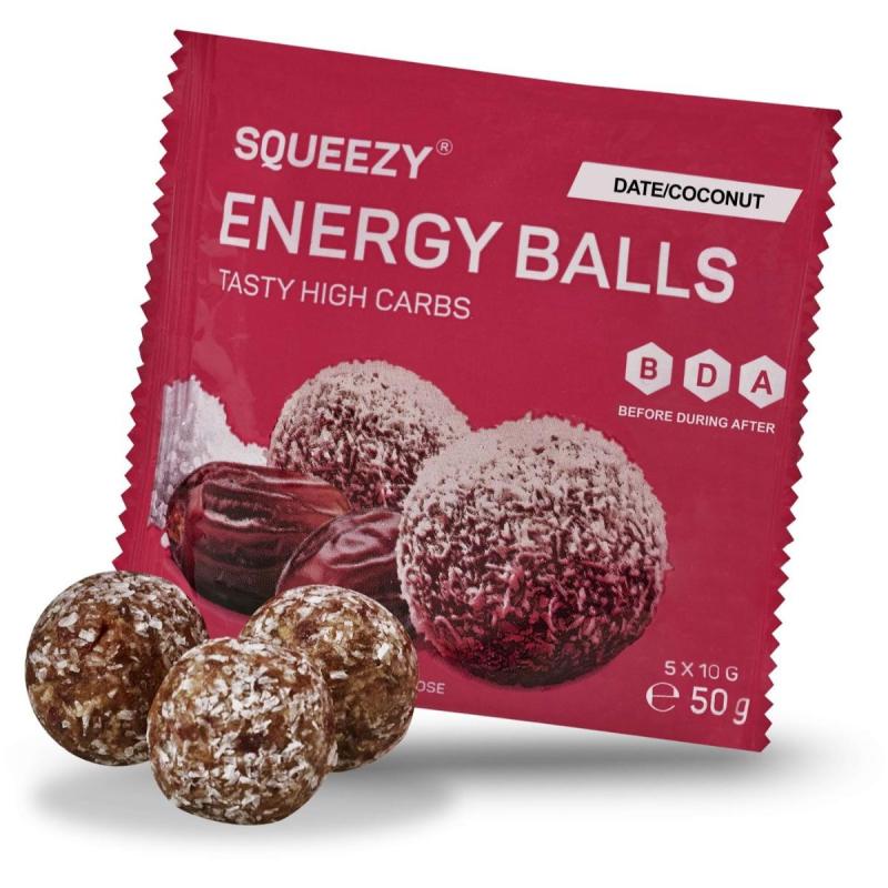 Squeezy Energy Balls med smak av dadler og kokosnøtt er et høykarbo energitilskudd myntet på langdistanseutøvere. Med hele 71g karbohydrater per 100g, lavt fettinnhold og tilstedeværelse av de to viktige mineralene natrium og kalium kan du fint la en energigel eller to bli liggende hjemme og heller sette din lit til disse velsmakende energikulene. Energikulene er veganske og laget av naturlige ingredienser, produsert ved en liten fabrikk i Tyskland som spesialiserer seg på økologiske produkter. Kulene kommer dessuten pakket i en økologisk nedbrytbar pose laget av cellulose og stivelse.